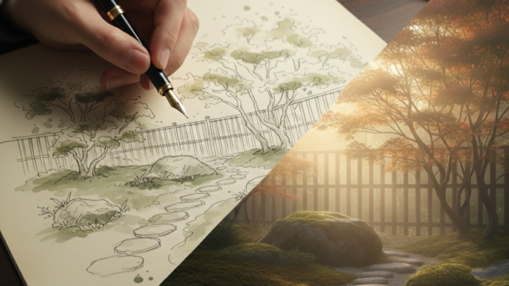 私たちが描くのは、単なる庭の図面ではありません。 その土地が持つ記憶、そこに流れる風の音、そしてお客様がそこで過ごす時間の質。 言葉にならない「想い」を、空間の「意志」へと翻訳することが、私たちの意匠設計です。